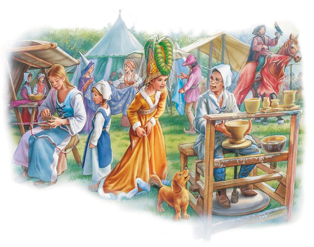 Девушка в крестьянском платье прядёт пряжу. Как ловко снуют её пальцы! А чуть дальше продают ткани, расшитые цветами, гербами, драконами.