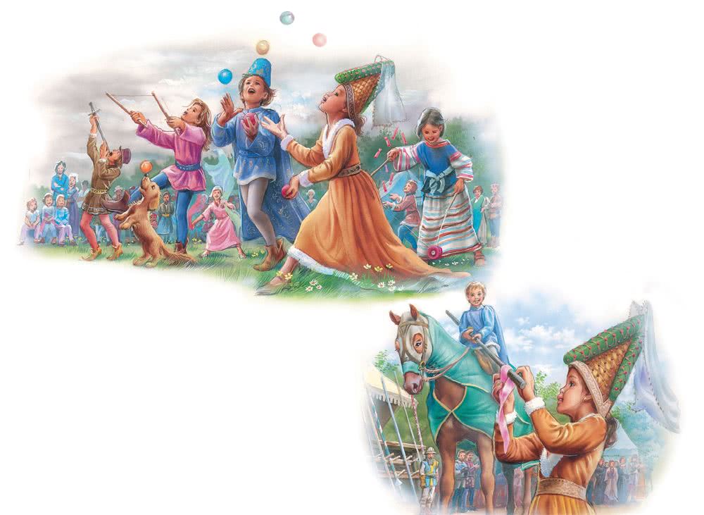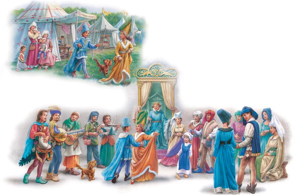 Мы взялись за руки и пошли туда, откуда слышалась музыка. Музыканты расположились на большой площадке. Таких инструментов я никогда не видала и не слыхала, только из книжек знаю их названия: тамбурины, лютни, виолы, волынки… И музыка непривычная, но очень красивая.