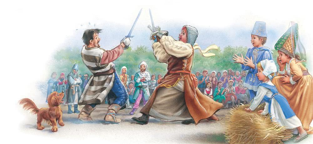 На другой поляне сражались на мечах. Бои, конечно, были шуточные, но звон стоял, как на настоящем поле битвы.