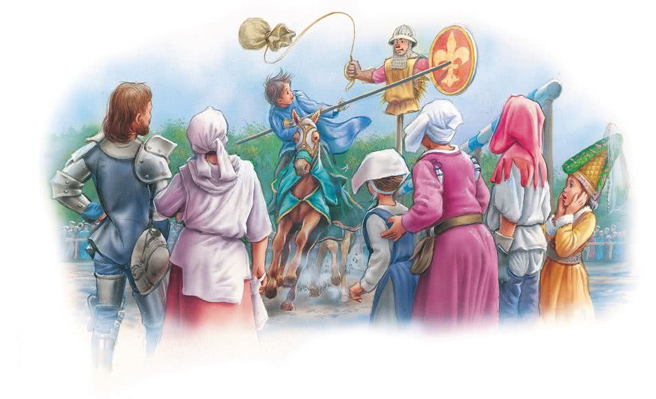На высоком шесте я увидела соломенного воина. Это и было чучело, с которым Костя и другие участники карнавала собирались сражаться. В одной руке у воина щит, в другой – тяжёлый мешок на верёвке. Нужно на полном скаку попасть копьём в середину щита.