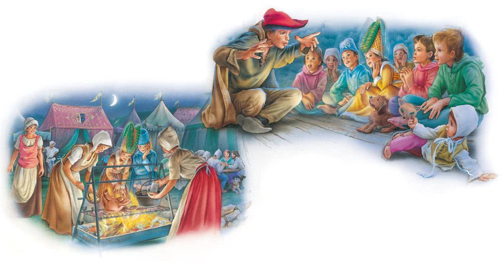 Мастера и торговцы, бароны и принцы, воины и музыканты разошлись по шатрам. Тут и там за длинными столами сидят и ужинают горожане.
