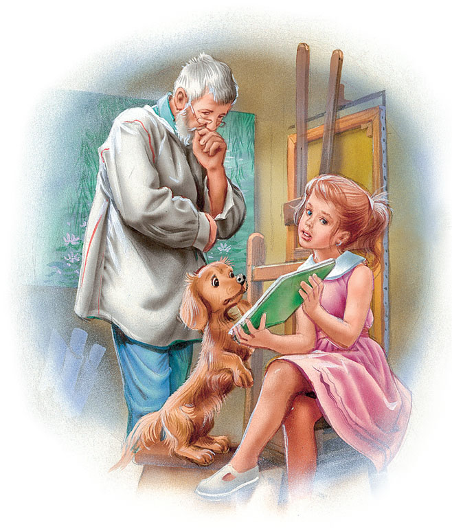 Привет! Меня зовут Маруся. А это мой младший брат Филя и наша собака Таксик. Филя ходит в детский сад, а я уже во второй класс перешла. Таксик в школу не ходит, он и так у нас очень умный.