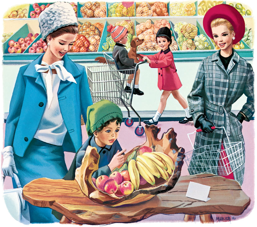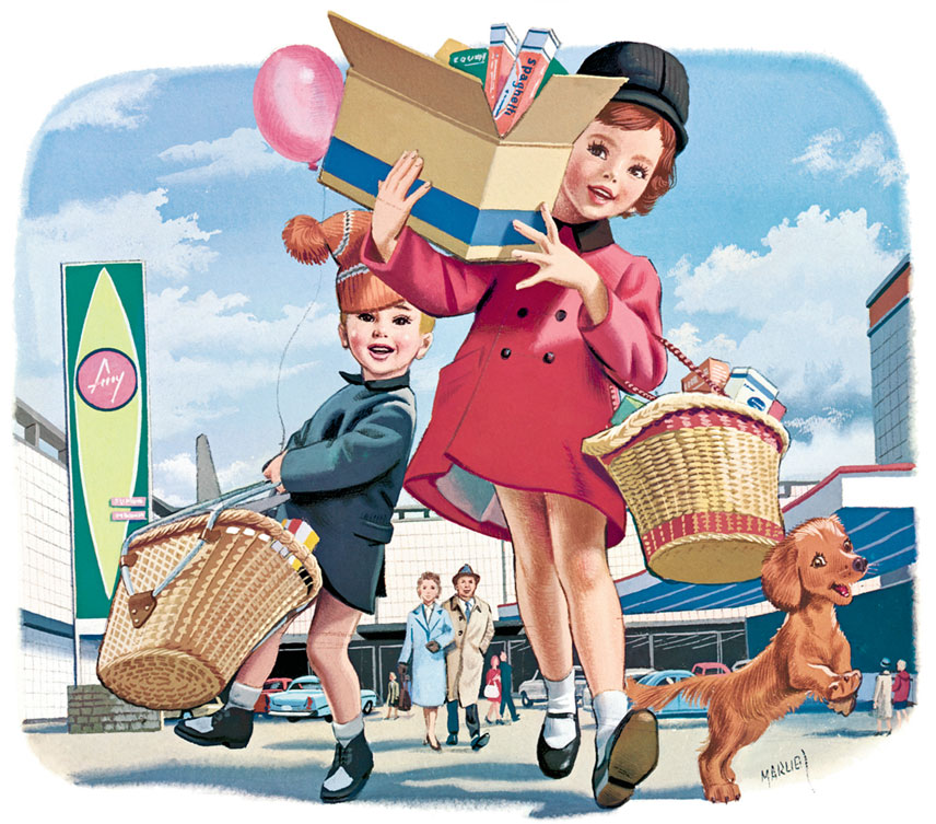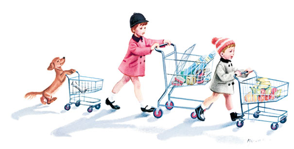 Всё вкусное вот тут, в огромном зале. Берём тележку. Я буду грузить в неё всякую всячину, а Филя с Таксиком – кататься в своё удовольствие. Они ужасно рады, а главное, не потеряются. Когда я была маленькая, мама вот так же сажала меня в тележку. И Таксика я держала на руках так же, как теперь держит Филя. Таксик тогда был ещё щенком.