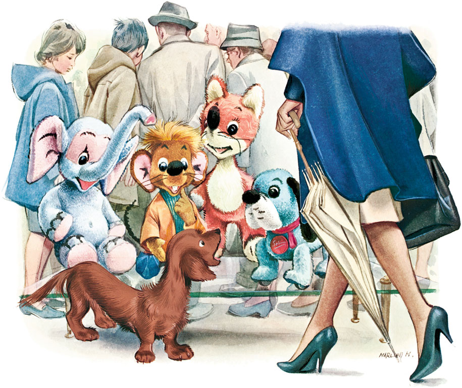 В субботу в магазине полно народу. Таксик куда-то юркнул и потерялся. Вокруг чужие люди, никто его и не замечает. Но умный Таксик нашёл зверей – они точно должны ему помочь.