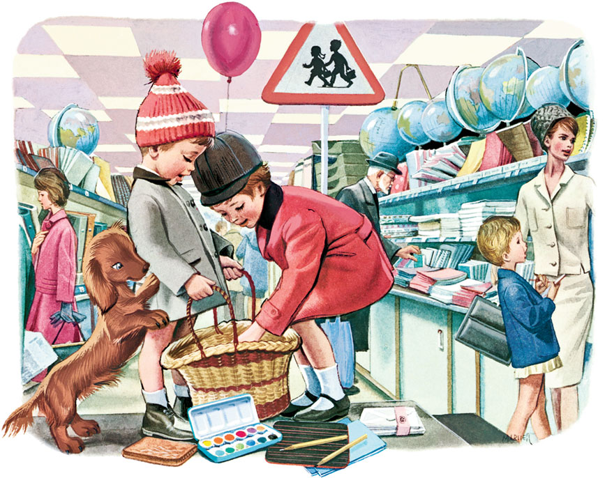 Канцелярский отдел – нам сюда! Скоро сентябрь, столько всего нужно для школы! Я даже список составила: тетрадки, ручки, краски, альбом, фломастеры, карандаши, точилка, клей и ластик.