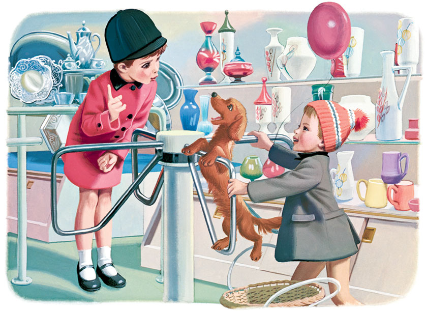 – Не туда, Филя! Слезай, Таксик! Тут нет ничего съедобного! Одна пустая посуда: чашки, миски, тарелки.