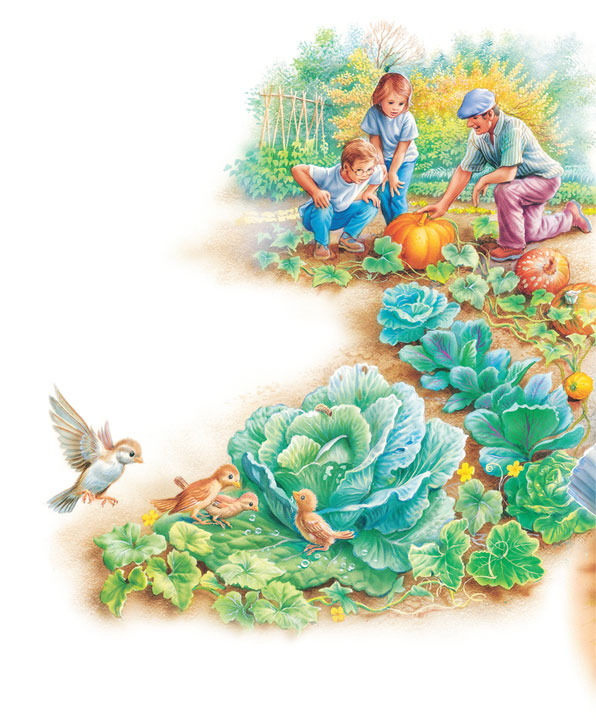 – Вот это самая большая тыква! Если сварить из неё кашу, хватит на сто человек! А тут капуста, уже можно срезать кочаны.