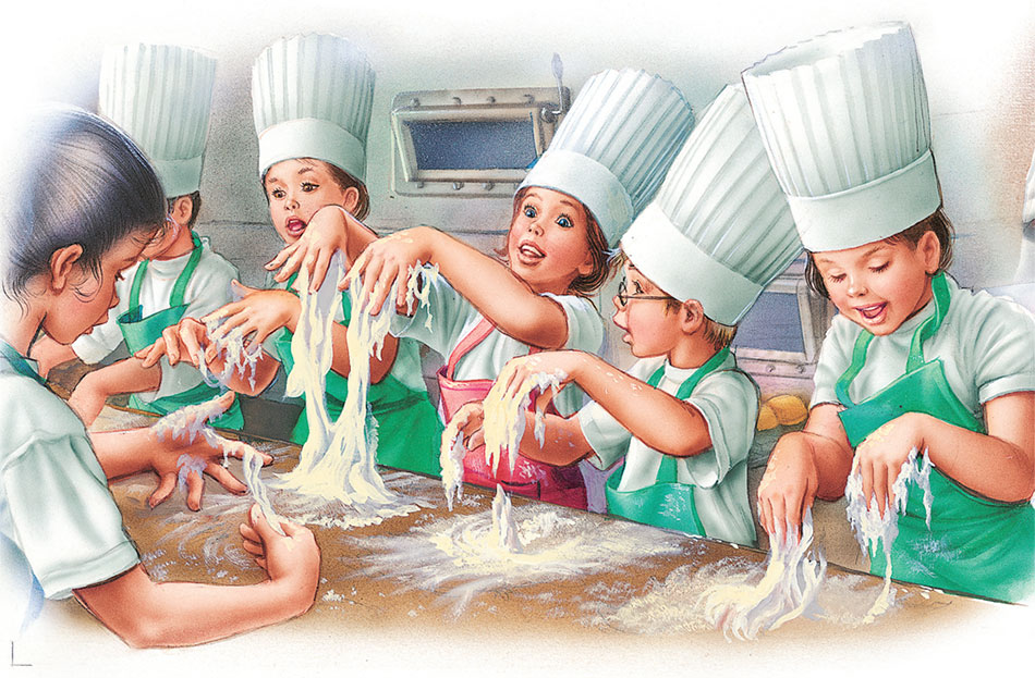 – Сегодня будем делать хлеб. Что для этого нужно? Мука, вода, соль и дрожжи.