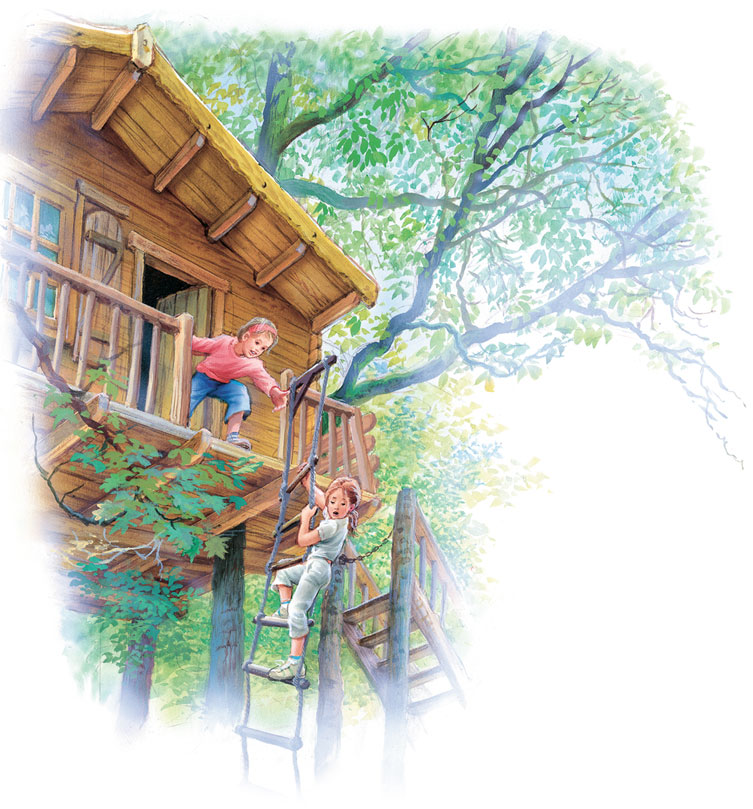 Аня предложила забираться в домик не по обыкновенной, а по верёвочной лестнице. Это не так легко, зато интересно.