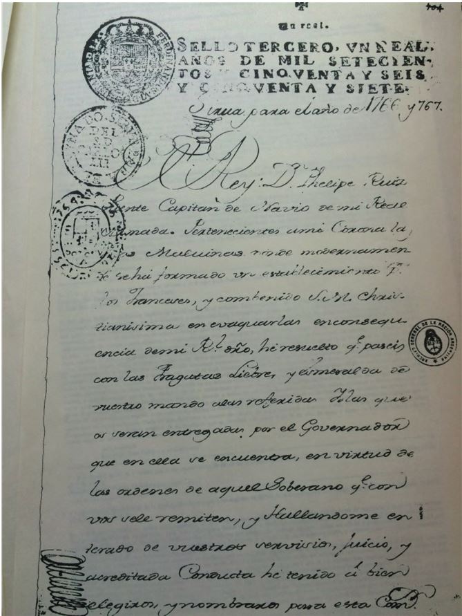 Илл. 4 Королевский приказ, в котором говорится о том, что дон Фелипе Руис Пуэнте был назначен губернатором Фолклендских/Мальвинских островов и о том, что острова будут подчиняться генерал-капитанству провинции Буэнос-Айрес – AGN. Sala X 8-10-3