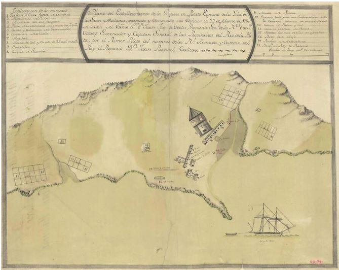 Илл. 6 Рисунок Порт-Эгмонта, уничтоженного испанцами; описание гласит: «Рисунок поселения англичан в Порт-Эгмонте на острове Гран-Мальвина, соженного и разрушенного 22 марта 1780 года по приказу Его Превосходительства дона Хуана Хосе де Вертиса, генерала королевской армии, вице-короля, губернатора и генерал-капитана правинций Рио-де-ла-Платы, исполненный первым лоцманом отряда военно-морского флота, капитаном доном Хуаном Паскуалем Кальесасом»