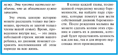 В конце каждой главы, посвященной очередному месяцу беременности, вы найдете пару страниц, которые помогут вам вести собственный дневник беременности. После рождения малыша вы можете сделать копию этих страниц и сшить их в дневник, который будет представлять ценность как для вас, так и для второго персонажа этого произведения.
