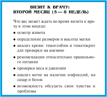 ВО ВРЕМЯ ВТОРОГО МЕСЯЦА БЕРЕМЕННОСТИ (с пятой по восьмую неделю) большинство женщин говорят о том, что определенно «ощущают себя беременной». Даже те, у кого в первый месяц симптомы беременности были выражены слабо, теперь чувствуют – хотя бы немного – тошноту и усталость. С этого момента ваше тело ежедневно будет напоминать вам о чуде, которое происходит внутри вас. Теперь уровень гормонов, необходимый для увеличения размеров матки и развития ребенка, вызывает эмоциональные и физические изменения, не поддающиеся сознательному контролю. С радостью встречайте эти быстрые изменения. Вы должны испытывать особое чувство гордости, ощущать себя частью чуда. Напомните себе, что ваши ощущения уникальны: миллионы женщин до вас уже были беременны, но только вы носите в себе своего ребенка. Когда вы подумаете о том, что всего за девять месяцев дадите начало новой жизни, то затраченное время, а также некоторые неудобства и дискомфорт отойдут на второй план.