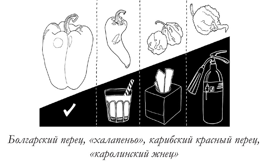 Далеко не просто так в английском языке вкус перца чили и капсаицина, который он содержит, описывается словом hot, что значит «горячий». На языке и в слизистой оболочке рта у человека находятся нервные окончания, позволяющие нам чувствовать также высокую температуру. Благодаря им, если вы наберете полный рот супа и он окажется слишком горячим, вы сразу узнаете об этом. На самых кончиках нервных клеток есть клеточные мембраны, которые включают в себя белок. Защитный механизм запускается при температуре 43 °C: белок начинает менять форму и открывает отверстие в мембране нервных клеток, позволяя ионам кальция проникать внутрь. Это, в свою очередь, запускает нервный импульс, «выстреливающий» в ваш мозг сообщение, которое вы расцениваете как тепло и боль. Этот белок носит крайне незапоминающиеся названия: «катионный канал с транзиторным рецепторным потенциалом», «ванилоидный рецептор 1»[3] и «терморецептор», а для ученых – TRPV1. Оказывается, что не только тепло активирует TRPV1
