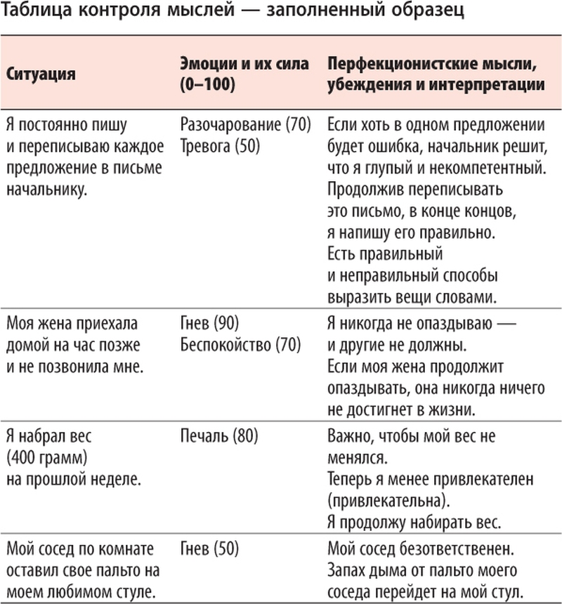 Наблюдая за своими реакциями со стороны, вам будет легче определить перфекционистские мысли. Осознание своих перфекционистских мыслей – первый шаг к их изменению. Эту проблему мы более подробно разберем в главе 7.