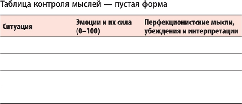 После прочтения заполненного образца в первой колонке пустого варианта запишите ситуации, которые вызывают ваши перфекционистские мысли или заставляют вас обратить на них внимание. Во второй колонке запишите эмоции, которые вы переживаете (например, страх, тревогу, печаль, подавленность и т. д.). Также запишите силу этой эмоции, используя шкалу от 0 до 100, где 0 означает «нет», а 100 равно самой сильной эмоции. В третьей колонке запишите свои перфекционистские убеждения и мысли.