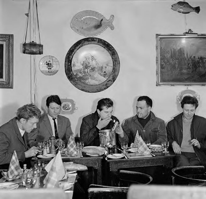 Тимоти Беренс, Люсьен Фрейд, Фрэнсис Бэкон, Фрэнк Ауэрбах, Майкл Эндрюс в ресторане Wheeler’s в Сохо. Лондон, 1963