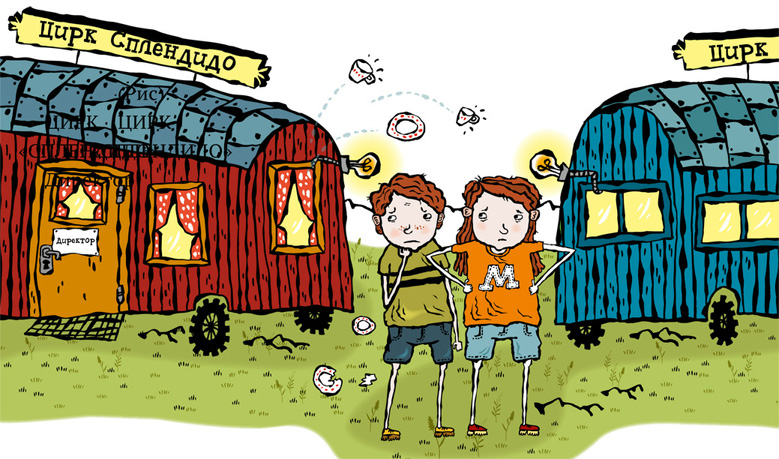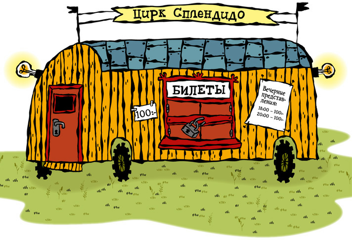 На лужайке у ее подножия стояли в круг цирковые фургоны. А в середине пестрел полосатый купол шапито. Лассе и Майя слезли с велосипедов и направились к цирку. На одном из фургонов большими красными буквами было выведено: ЦИРК «СПЛЕНДИДО». Здесь продавали билеты на представления.