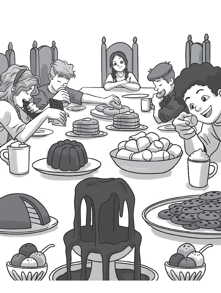 Оторвав глаза от потолка, я отскакиваю: прямо перед нами из ниоткуда возник огромный стол. На нём стоят блюда со сладостями.
