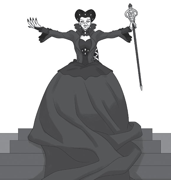 Услышав перестук каблуков, я резко оборачиваюсь и вижу… королеву. От неё исходит такая мощь, такое величие, что никто из нас не может оторвать от неё глаз. На ней тёмно-красное бархатное платье – очень… готичное. Юбка расширяется колоколом от талии и стелется по полу. Платье выглядит тяжёлым, роскошным и таким необъятным, что королеве приходится придерживать подол двумя руками, чтобы не упасть. Длинные широкие рукава завершаются манжетами в виде пышных оборок. Губы у неё красные, как её платье, кожа фарфорово-белая, а чёрная маска наполовину скрывает её лицо. Такие маски носят на карнавалах.