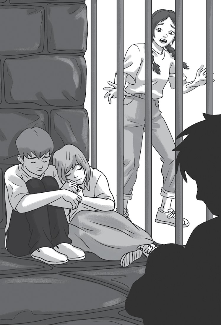 – Наконец-то кто-то пришёл! – восклицает один из мальчиков и тут же умолкает. Затем он спохватывается: – Погодите-ка! Что вы здесь делаете? Вы ведь не стражники…