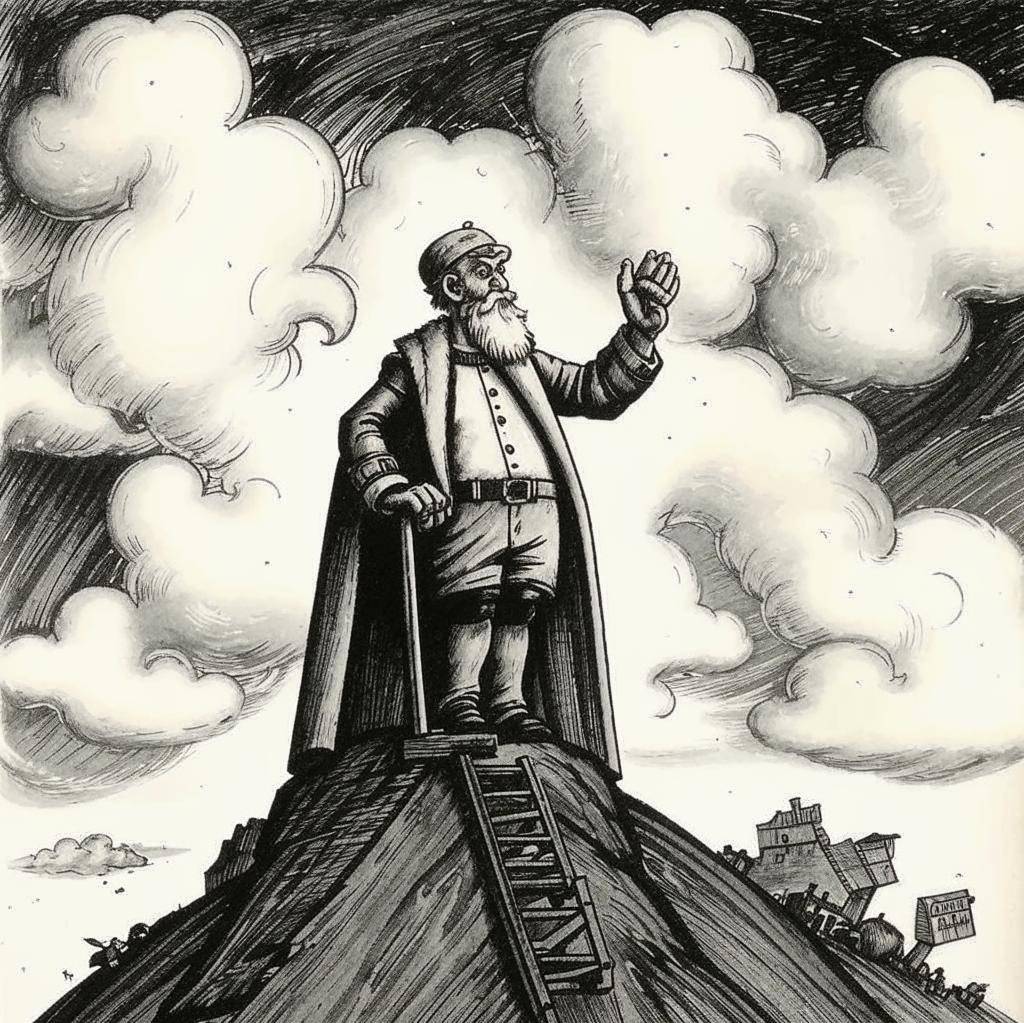 И снова, долго ли коротко ли, а прошла ночь. Утром царь обнаружил в огороде чудесный колодец необозримой глубины. Только вот не было Соловья-разбойника. Лишь одинокая деревянная лестница тянулась вглубь жерла, да рядом лежали одинокие брезентовые штаны. Царь попробовал позвать из глубины веков Соловья, но никто не отозвался. Так и ходил царь каждое утро, на протяжении двух недель в ожидании появления добытчика с ведром каменного угля. Но на все попытки докричатся до копателя , не отзывалось даже эхо. На исходе второй недели царь позвал народ и велел вытащить лестницу, надеясь на другом её конце увидеть Соловья-разбойника. К обеду, когда уже было вытащено 5 километров, лестница все ещё не вылезла из колодца, зато другой её конец во что-то уперся в облаках и застрял. Царь велел народу изо всех сил держать лестницу, чтоб не упала, а сам позвал известных братьев-умельцев по прозвищу «Трое из ларца – одинаковы с лица». Он велел им лезть по лестнице наверх и узнать, в чем причина остановки. Полез старший брат-умелец. Ждали его обратно один день и одну ночь. Не вернулся брат. Нехотя полез средний брат-умелец. Ждали его два дня и две ночи. Но и этот родственник не вернулся. Младший из братьёв вообще упёрся и сказал, что нипочём на эту страсть не полезет. Но его силой и угрозами заставили улезть наверх. Братьев-исследователей ждали ещё три дня. И когда у народа уже затекли руки и он хотел уже отпустить лестницу, как вдруг с другого её конца, уходящего вглубь колодца, послышались загадочные звуки шуршания и карабканья. Не прошло и минуты, как на поверхность, чихая грунтом, вылез старший брат-умелец. Ещё через минуту, оптлёвываясь глиной, показался средний, а за ним, с рожей перепачканной каменным углём мезозойской эры, выскочил и младший из братьёв.