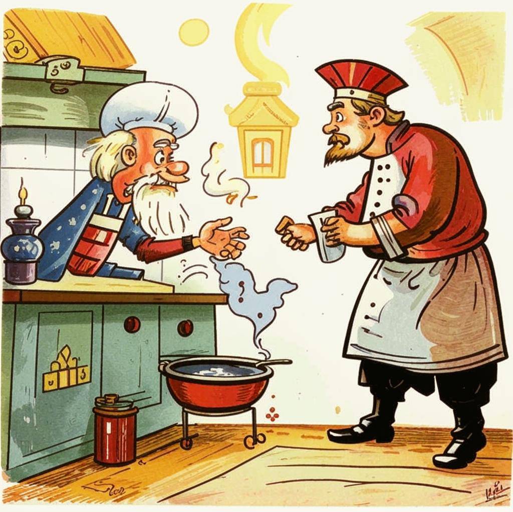 С утра пораньше царя Додона известная всем муха укусила. Причем именно в тот момент, когда он подсчитывал на калькуляторе прямые доходы и убытки. Ну, и распсиховался наш самодержец. Взбеленился-таки. Спрыгнув с трона Додон подбежал к неприметной двери и всем своим царским организмом грянулся об нее. Дверь распахнулась и открылась кухня. Посреди кухни стоял царский стряпчий Устиныч и черпаком мешал варево в расписном старинном горшке, подвешенном над костром.