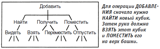 Мы уже видели, что навыки Строителя возможно свести к более простым навыкам «Взять» и «Поместить». Далее мы выяснили, что и эти навыки в свою очередь возможно разложить на еще более простые операции. «Взять» означает «Пошевелить рукой», чтобы «Поднять кубик», только что обнаруженный при помощи навыка «Найти». «Поместить» же означает «Пошевелить рукой», чтобы положить этот кубик на макушку башни. В результате может показаться, что все навыки Строителя разделяются на простейшие операции.
