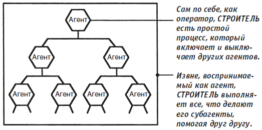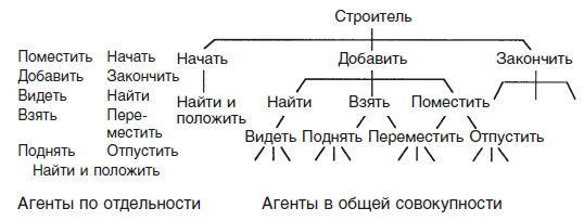 Однако в этой схеме упущено кое-что важное. Строитель представляет собой не просто набор элементов наподобие «Найти», «Взять», «Поместить» и пр. Строитель не начнет действовать до тех пор, пока эти «малые» агенты не окажутся связанными друг с другом через сеть взаимоотношений.