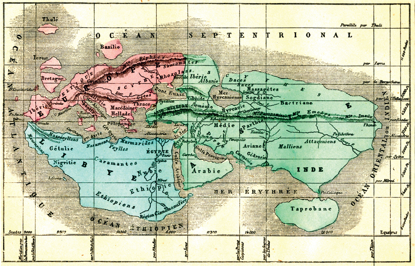 The World by Eratosthenes. 1886 replica of a map of the known world according to the Ancient Greek geographer, mathematician and astronomer Eratosthenes.