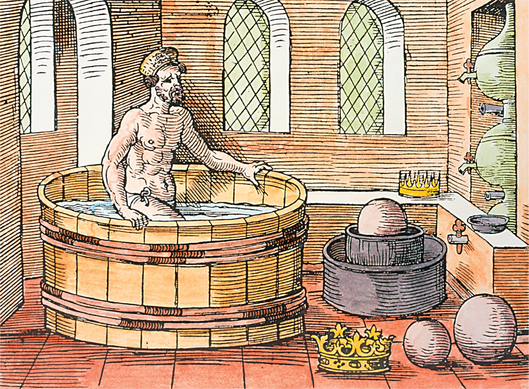 An imaginative portrayal of the Greek mathematician and physicist Archimedes (287–212 BC) in his bath. Archimedes showed that an object immersed in a fluid is supported with a force equal to the displaced fluid’s weight (Archimedes’ principle).