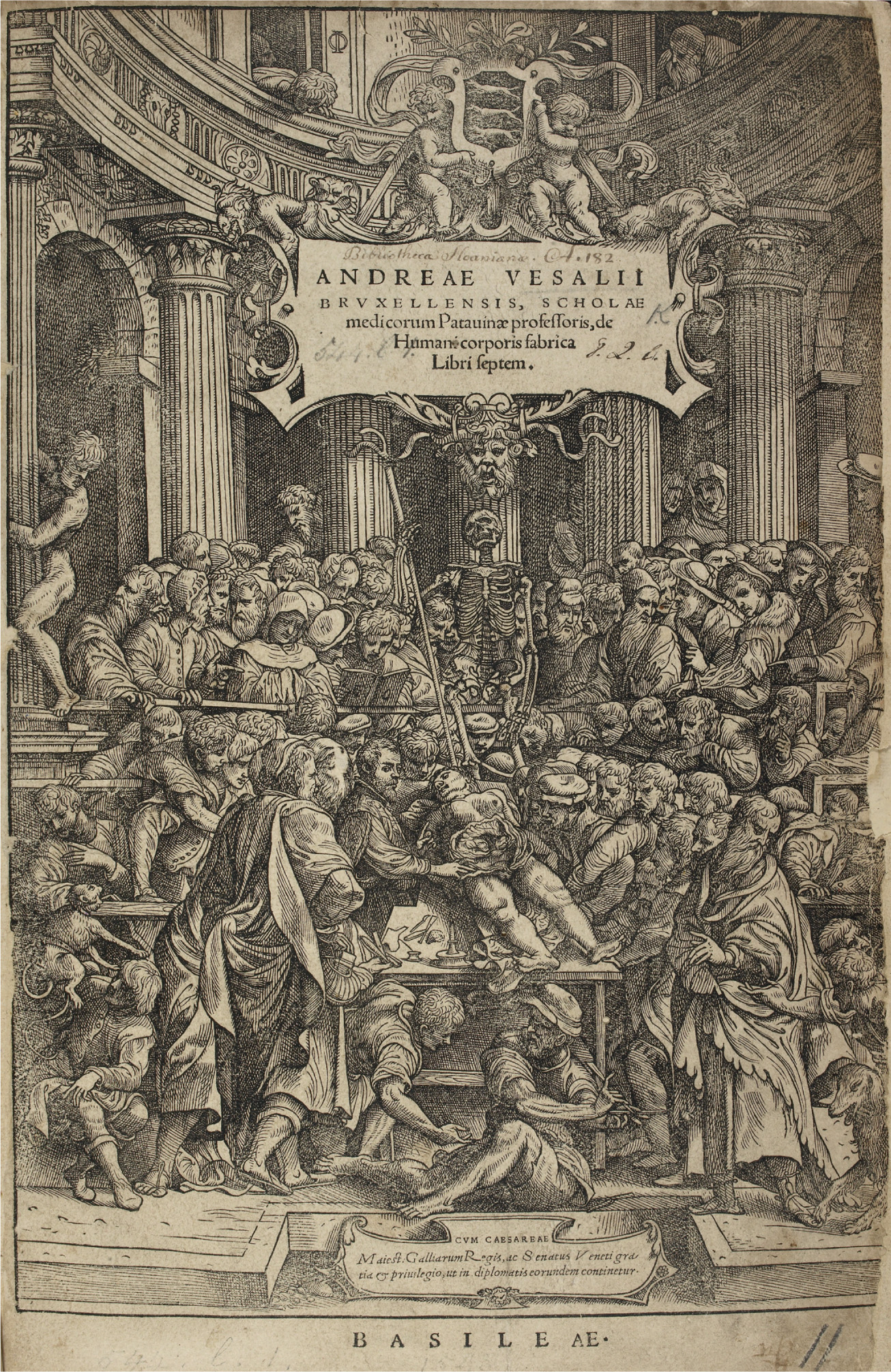 Sixteenth-century frontispiece from De Humani Corporis Fabrica, showing a public dissection.