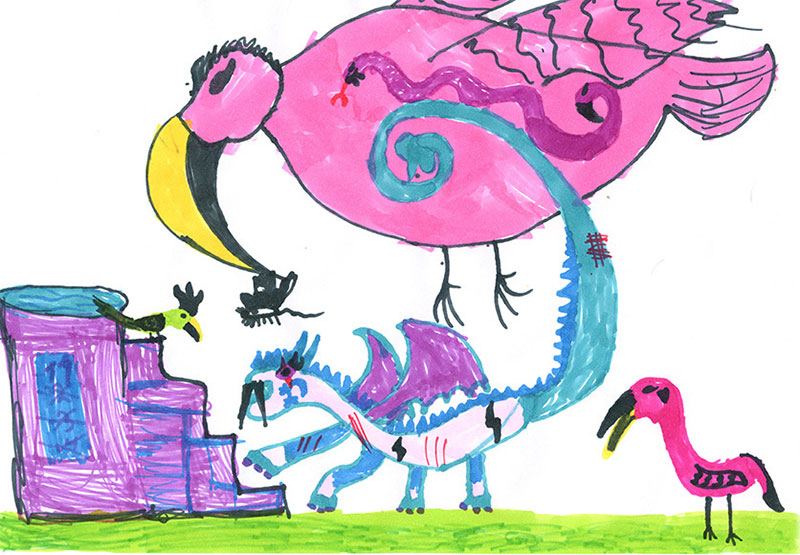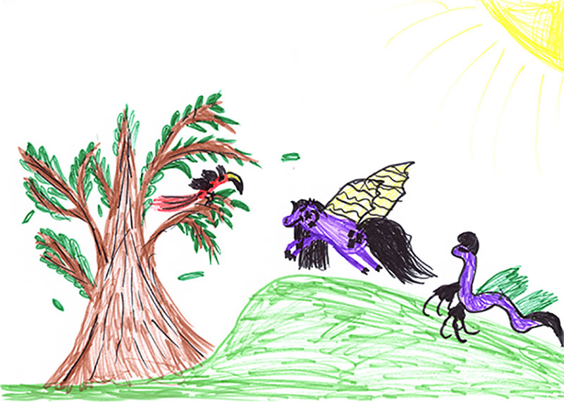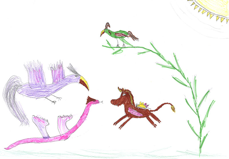 И вдруг к ней прилетели одна большая Птица Фиолетовая и одна Змея Розовая.