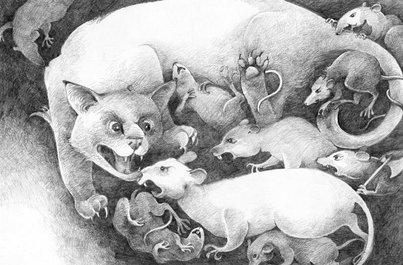 Директор, которого поднял с постели телефонный звонок – в музее происходит что-то страшное и необъяснимое, – прибыл туда одновременно с полицейской патрульной машиной. Люди застыли на пороге огромного музейного зала, по которому бегали сотни, нет тысячи мышей, а на них яростно кидались коты. В воздухе летали клочки шерсти, на полу лежали раненые и убитые коты и мыши.