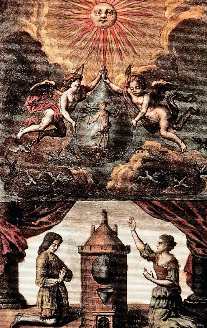 Одиннадцатая иллюстрация к Mutus Liber. Два ангела возносят сосуд, внутри которого находится Меркурий