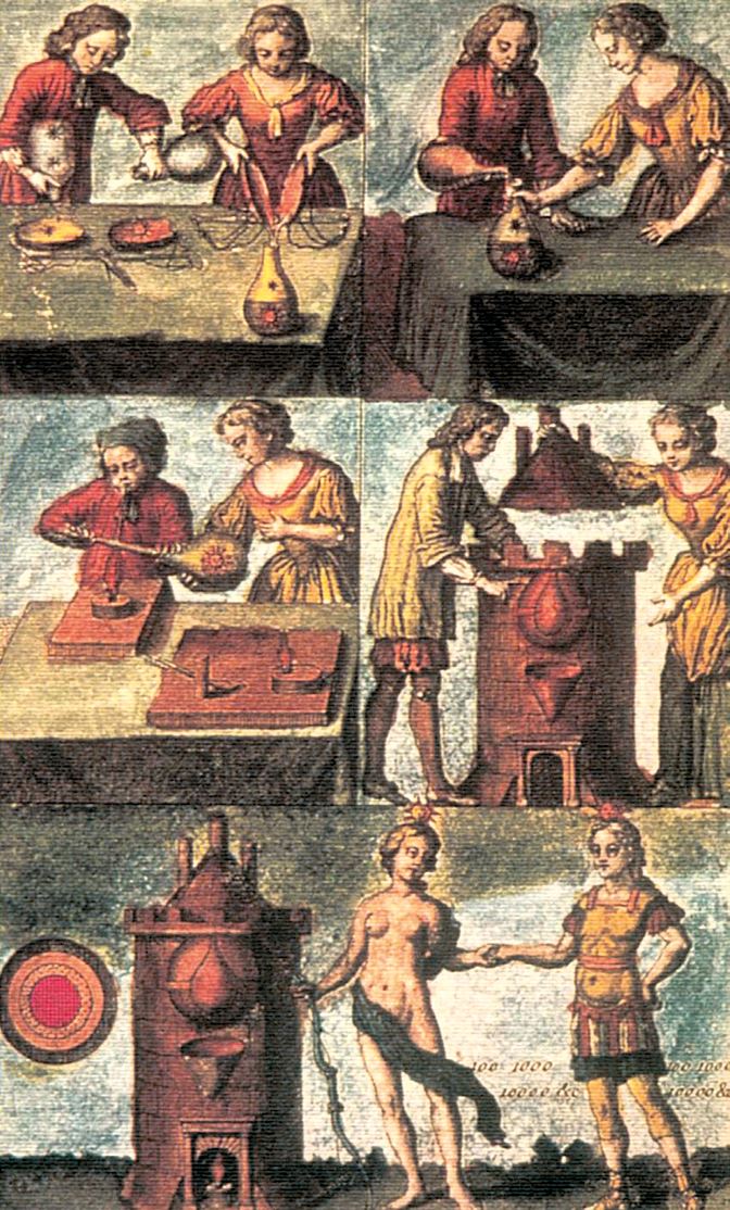 Десятая гравюра из книги Mutus Liber: алхимик соединяет две субстанции в Философском Яйце, разжигает огонь и нагревает содержимое. Внизу, сбоку от печи, находятся Солнце и Луна