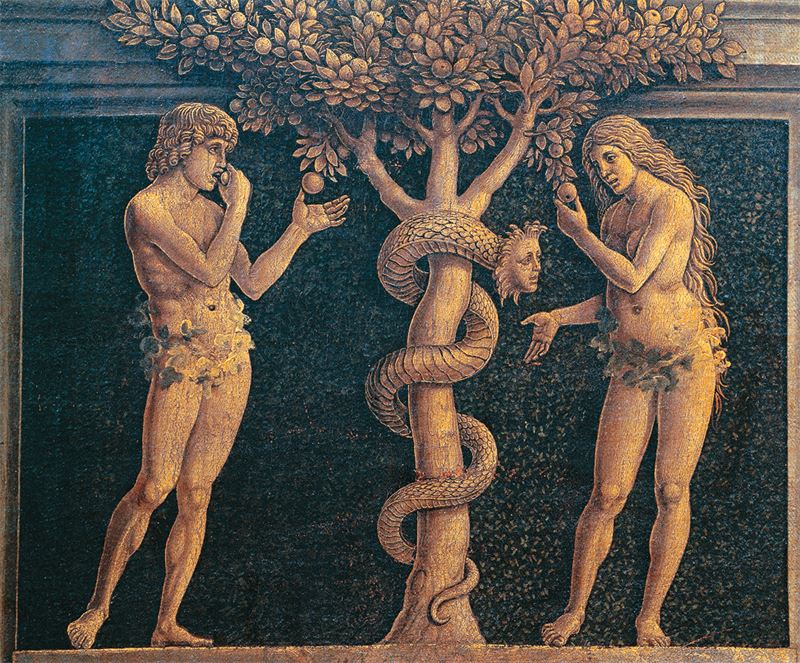 Адам и Ева совершают первородный грех. Андреа Мантеньи. Деталь картины «Мадонна Победы». 1496. Франция, Париж, Лувр