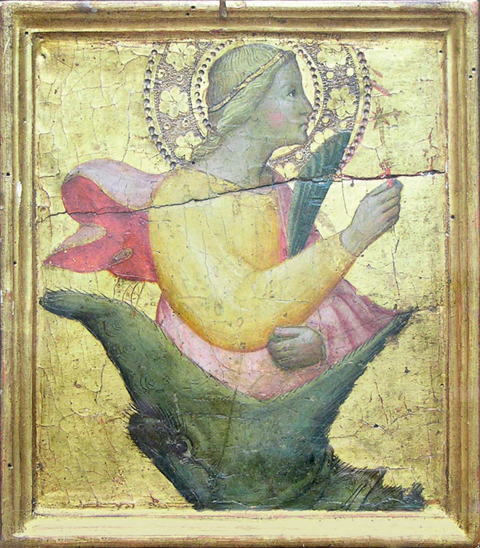 Аньоло Гадди и ученики. Святая Маргарита и дракон. Ок. 1390. Нью-Йорк, Метрополитен-музей. Согласно легенде, святую проглотил Сатана, принявший облик дракона, но ей удалось спастись благодаря кресту, который она носила с собой
