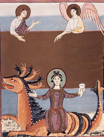 Зверь Апокалипсиса, изображенный в рукописи «Бамбергский Апокалипсис». XI в. Городская библиотека города Бамберг