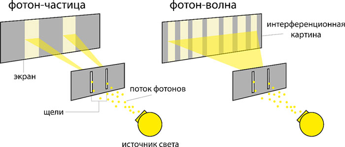 Свет можно трактовать и как поток частиц – фотонов, и как волну. Свет демонстрирует свойства волны в явлениях дифракции и интерференции. Но более того, даже одиночные фотоны (частицы), проходящие через двойную щель, создают на экране интерференционную картину, свойственную только волновому поведению[11].