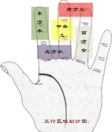 От указательного пальца до мизинца на суставах и между ними располагаются области, связанные с инь и ян, пятью элементами усин (五行), восемью триграммами багуа (八卦), десятью небесными стволами (天干) и двенадцатью земными ветвями (地支).