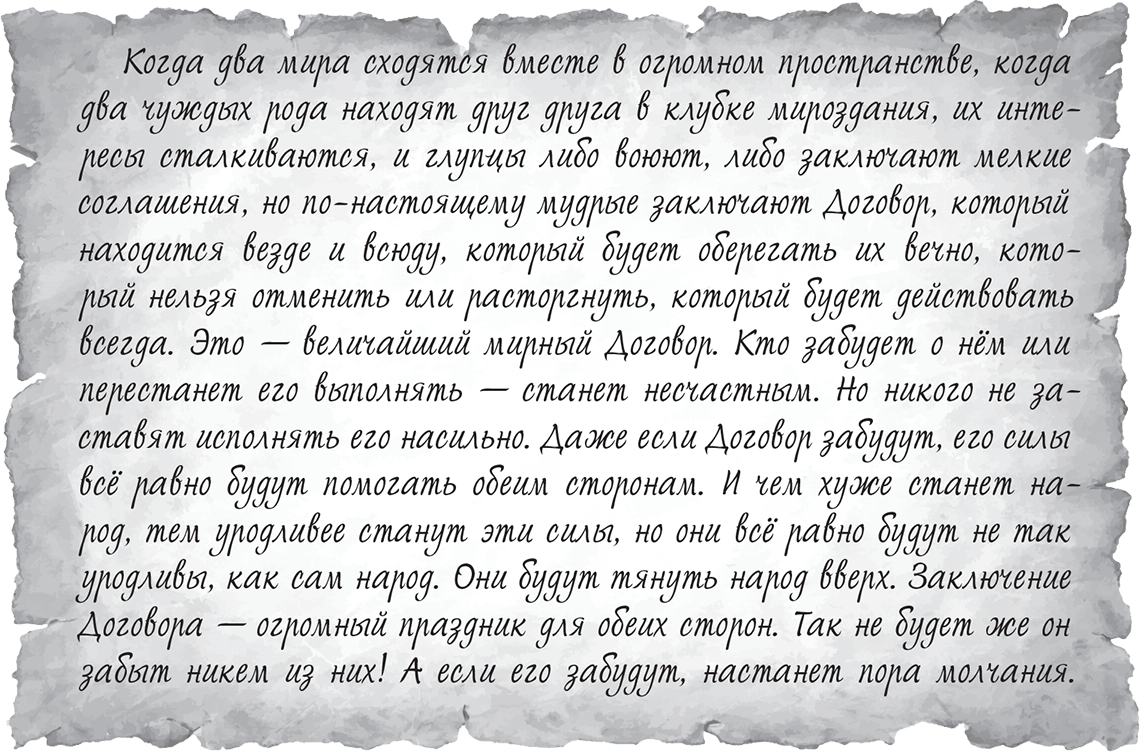Когда два мира сходятся вместе в огромном пространстве, когда два чуждых рода находят друг друга в клубке мироздания, их интересы сталкиваются, и глупцы либо воюют, либо заключают мелкие соглашения, но по-настоящему мудрые заключают Договор, который находится везде и всюду, который будет оберегать их вечно, который нельзя отменить или расторгнуть, который будет действовать всегда. Это – величайший мирный Договор. Кто забудет о нём или перестанет его выполнять – станет несчастным. Но никого не заставят исполнять его насильно. Даже если Договор забудут, его силы всё равно будут помогать обеим сторонам. И чем хуже станет народ, тем уродливее станут эти силы, но они всё равно будут не так уродливы, как сам народ. Они будут тянуть народ вверх. Заключение Договора – огромный праздник для обеих сторон. Так не будет же он забыт никем из них! А если его забудут, настанет пора молчания.