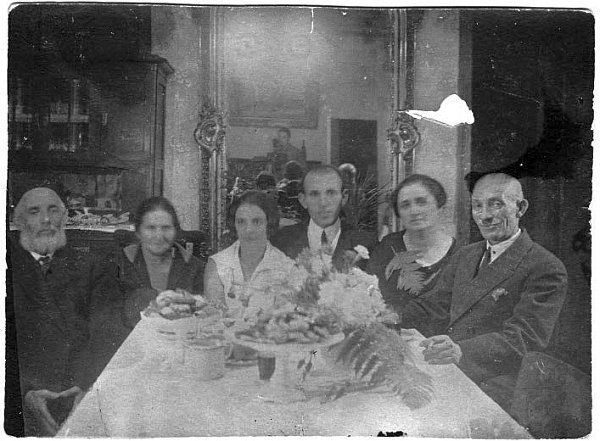 В центре сидит, думаю, вдова прадеда Ханины, чей портрет держат слева мой дед, Матвей Хромченко и справа его, предположу, брат, имени не знаю. Внизу слева сидит Наум, с ним рядом сестра Соня; справа от вдовы Ханины – жена «безымянного» брата Матвея и их дочери, двоюродные сёстры отца. С такой шевелюрой я его никогда не видел – в юности ему даже покупали «поповский» гребень с редкими зубчиками. Комментарий к снимку моей троюродной племянницы Анны Грандель, правнучки Ушера Хромченко, ещё одного сына Ханины: ей бабушка рассказывала, что когда Соломон их навещал, перед тем, как снять шарф, просил закрыть форточку.