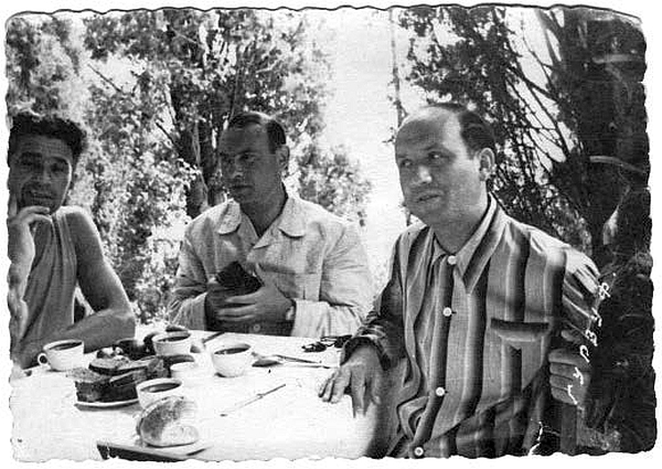 Слева направо: виолончелист Борис Реентович, неизменный многие годы директор касс ГАБТа Михаил Лахман – он умел на торжественных собраниях, спектаклях, концертах так рассадить партийно-правительственную номенклатуру, что все были довольны, потому его, уже еле ноги волочившего, до последних дней не отпускали на пенсию, – и отец. На фото нет Ивана Петрова, совместившего «обслуживание» пионеров со свадебным путешествием, с чем его все поздравляли: в это время игрок команды мастеров «Локомотива» (до поступления в театр) царил на волейбольной площадке.