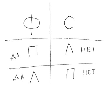 Все бродили в раздумьях над вопросом, который позволил бы убить двух зайцев одним выстрелом: выяснить, кто врёт, а кто говорит правду, и узнать, какая дверь ведёт к финалу. Агата начертила на песке таблицу. Написала вверху буквы «Ф» и «С». Ниже два раза «П» и «Л» в разных ячейках. Затем она про себя стала проговаривать какие-то выкладки и писать примечания в таблицу.