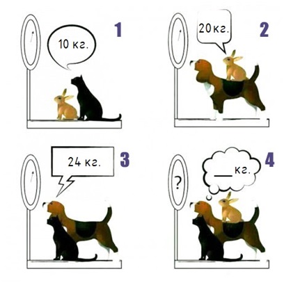 – Пусть вес кролика – X, кошки – Y, собаки – Z. Тогда X+Y=10 …