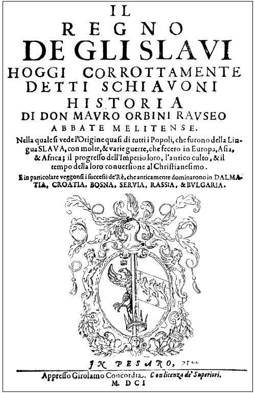 Собрана из многих книг исторических, чрез господина Мавроурбина, архимандрита Рагужского, в которой описуется початие и дела всех народов, бывших языка Славенскoго и единого Отечества, хотя ныне во многих Царствиях рacсеялися чрез многие войны, которые имели в Европе, во Азии и во Африке, раcширения их Империи, и древних обычаев, в разных временах, и познание веры Христа Спасителя, под многими Владетельми.