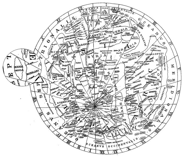 «Остров Скандза», согласно раннесредневековому описанию в широко известной «Космографии» Равеннского Анонима (около 700 г.). Карта реконструирована Конрадом Миллером (1844–1933) и опубликована в его многотомном труде: Konrad Miller. Mappae Мundi, Die ältesten Weltkarten. – VI. (Schlussheft): Rekonstruierte Кarten. – Stuttgart, 1898. – Таf. 1.