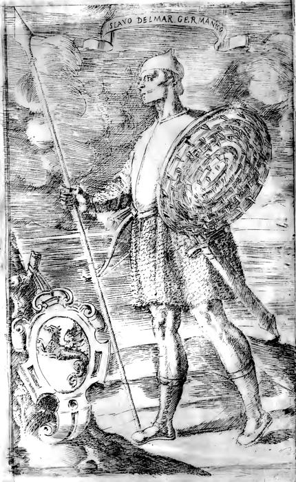 «Славянин Германского моря» («Slavo del Mare Germanico», иллюстрация из итальянского оригинала книги Орбини). Имеется в виду Балтика. Сам Орбини в тексте называет это море «Венедицким», то есть Славянским. В его время балтийские славяне были уже по большей части германизированы