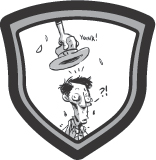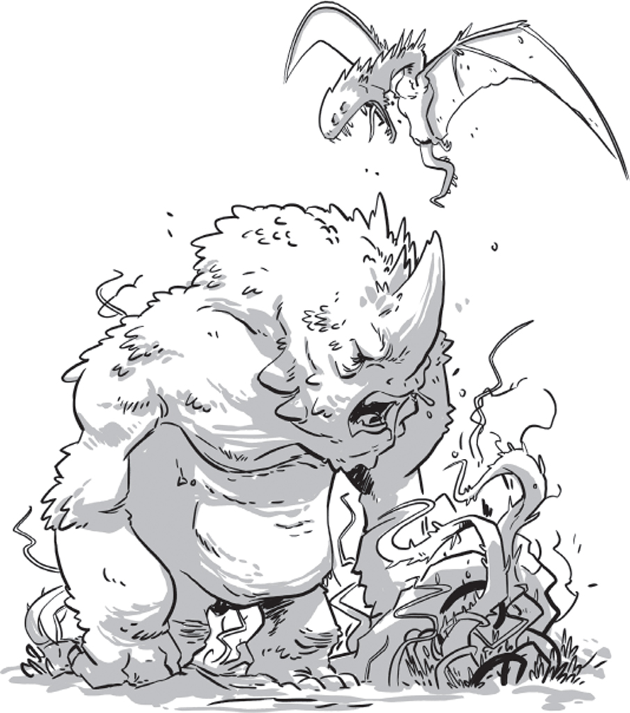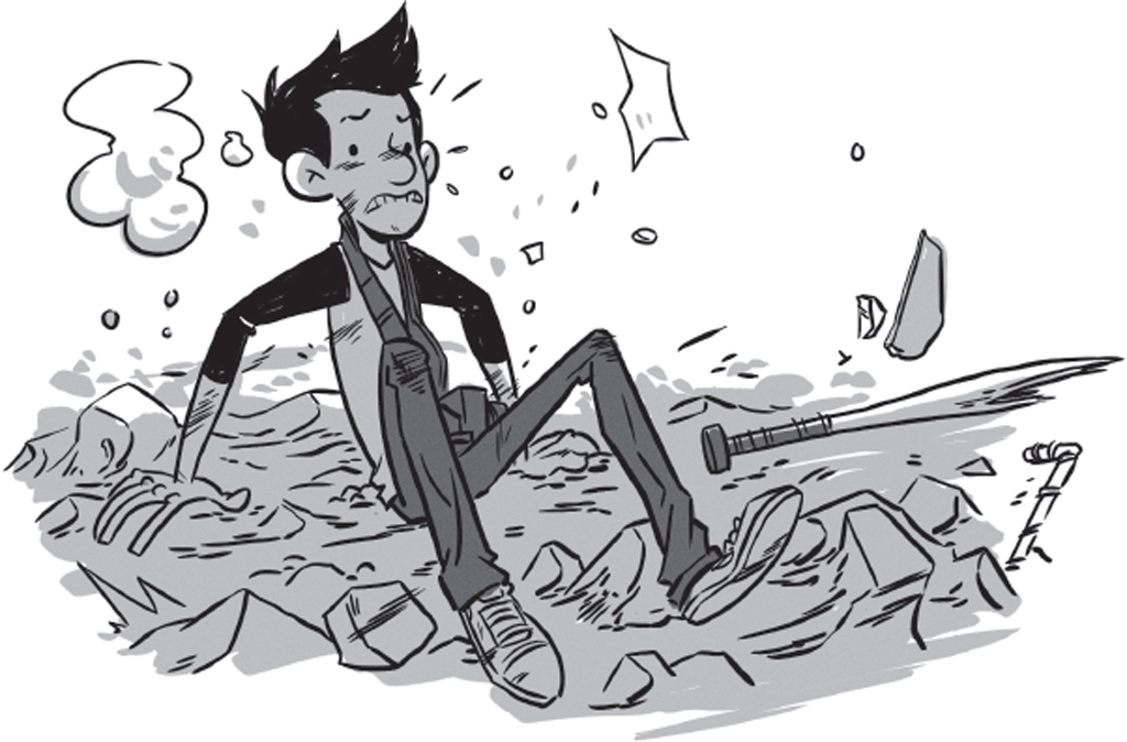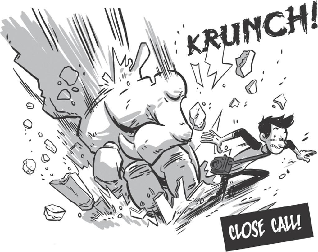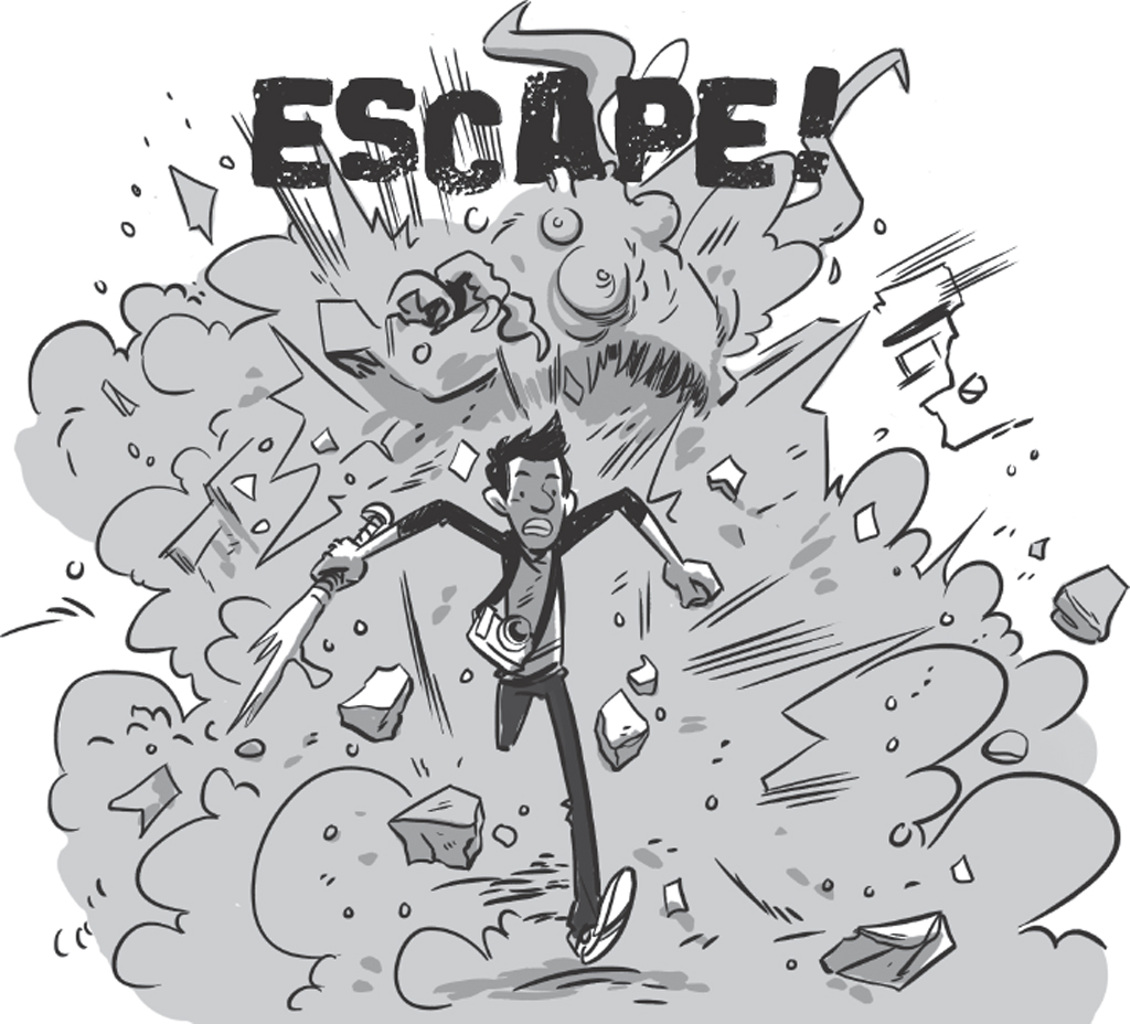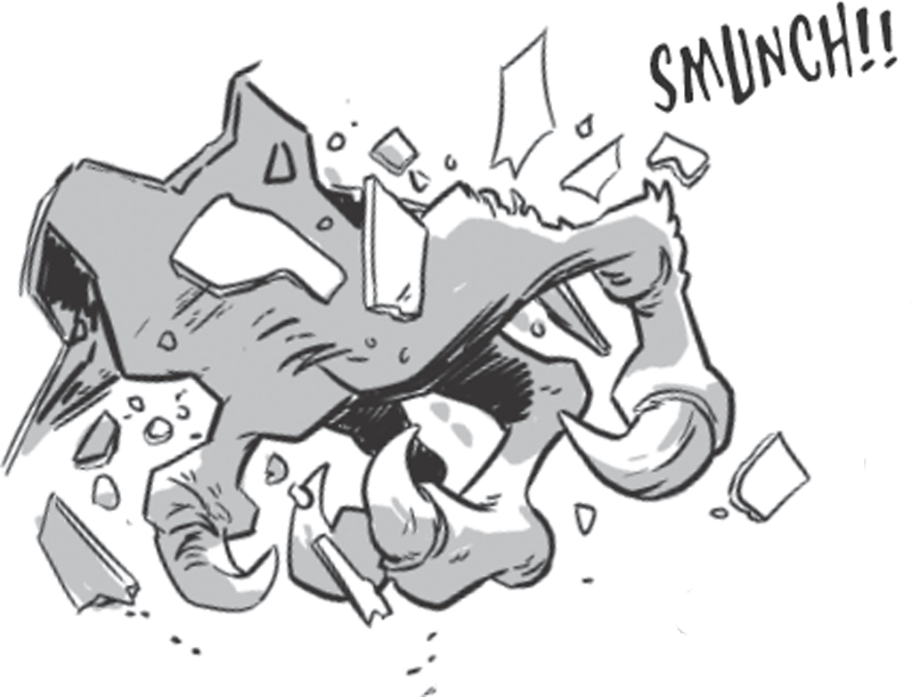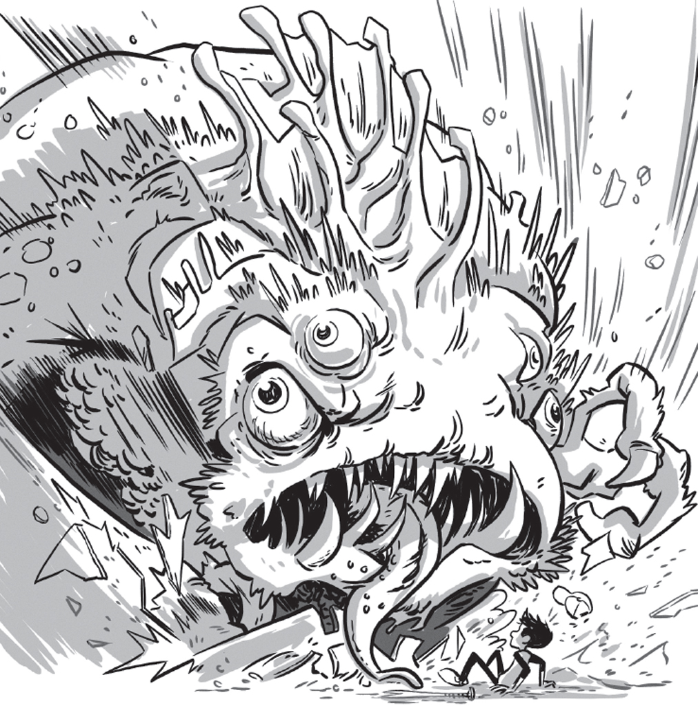 Yikes! The monster’s massive fist pounds the roof until it cracks like thin ice. I trip, tumble back and land hard on my bony butt.